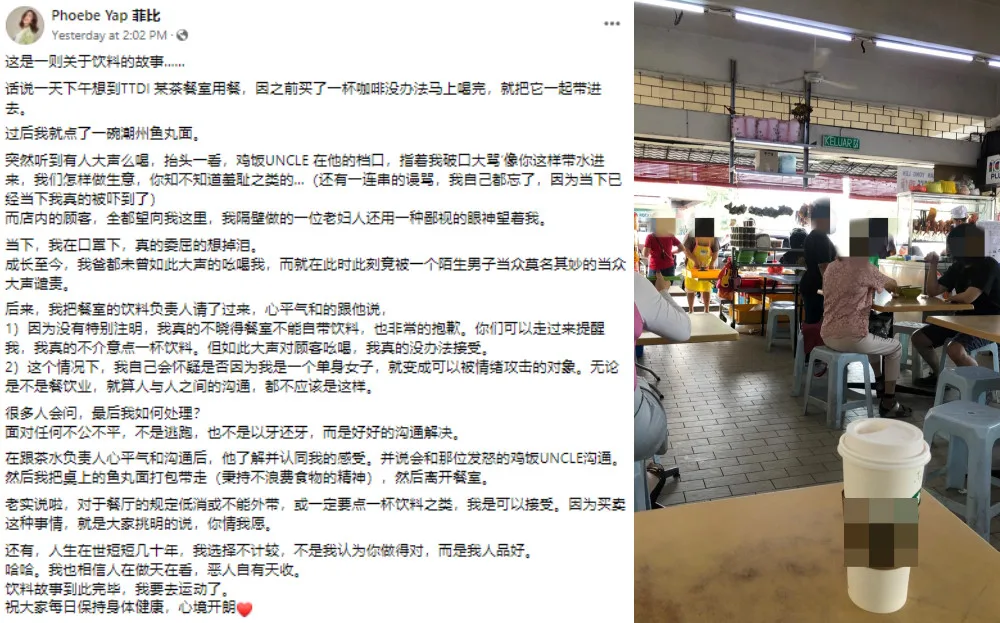 Thankfully, Phoebe decided to handle the matter maturely. She requested to speak with the owner of the eatery and discussed the issue with him. “Because there was no sign, I really didn’t know that you can’t bring your own beverages to the (eatery),” she said and apologised. “But shouting at a customer, I really can’t (handle) it.” Additionally, Phoebe brought up her concern that she was targeted since she was a lone woman.