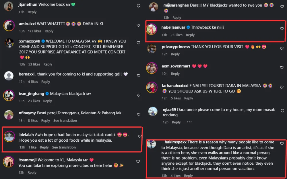 Malaysian netizens flood the comments with well wishes on her time in the city, such as Instagram user @/bielalah who commented, “Hope you had fun in Malaysia, kakak cantik. Hope you ate a lot of good food during your stay”. Netizens have also speculated if this was a throwback photo correlating to spotting Dara among the crowd on the 2nd day of G-Dragon’s concert in Malaysia.