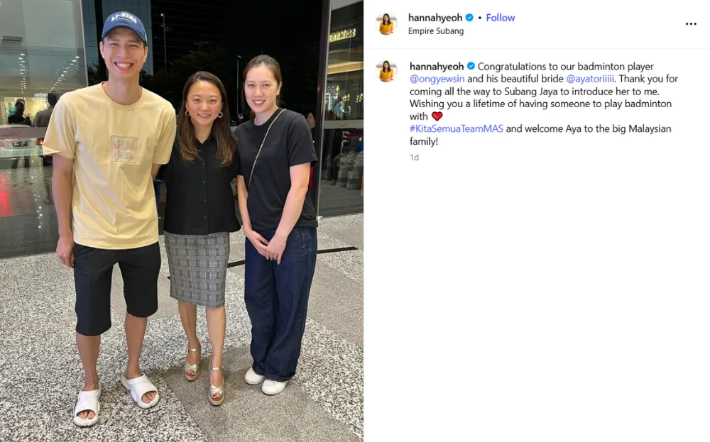 After the announcement, family, friends and badminton fans shared happy messages for the newlyweds. Fellow badminton players, including Aaron Chia, Low Juan Shen and Gloria Emanuelle Widjaja, shared congratulatory messages in the couple’s Instagram post. Meanwhile, Youth and Sports Minister Hannah Yeoh shared a separate post congratulating the couple on their marriage and welcoming Aya to the Team Malaysia family.