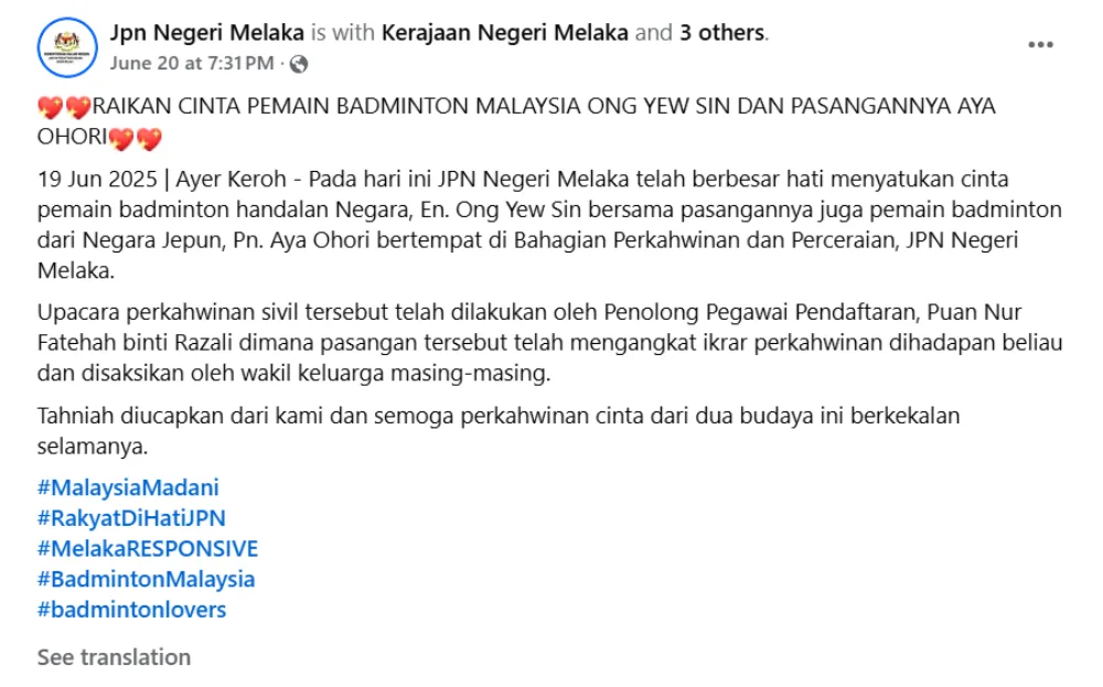 @jpnmelakaofficial 💖💖RAIKAN CINTA PEMAIN BADMINTON MALAYSIA ONG YEW SIN DAN PASANGANNYA AYA OHORI💖💖 19 Jun 2025 | Ayer Keroh – Pada hari ini JPN Negeri Melaka telah berbesar hati menyatukan cinta pemain badminton handalan Negara, En. Ong Yew Sin bersama pasangannya juga pemain badminton dari Negara Jepun, Pn. Aya Ohori bertempat di Bahagian Perkahwinan dan Perceraian, JPN Negeri Melaka. Upacara perkahwinan sivil tersebut telah dilakukan oleh Penolong Pegawai Pendaftaran, Puan Nur Fatehah binti Razali dimana pasangan tersebut telah mengangkat ikrar perkahwinan dihadapan beliau dan disaksikan oleh wakil keluarga masing-masing. Tahniah diucapkan dari kami dan semoga perkahwinan cinta dari dua budaya ini berkekalan selamanya. #MalaysiaMadani #Madanibekerja #KDNSejahteraMadani #KDNIhsanMadani #RakyatDiHatiJPN #MelakaRESPONSIVE #BadmintonMalaysia #badmintonlovers #jpndimanamana