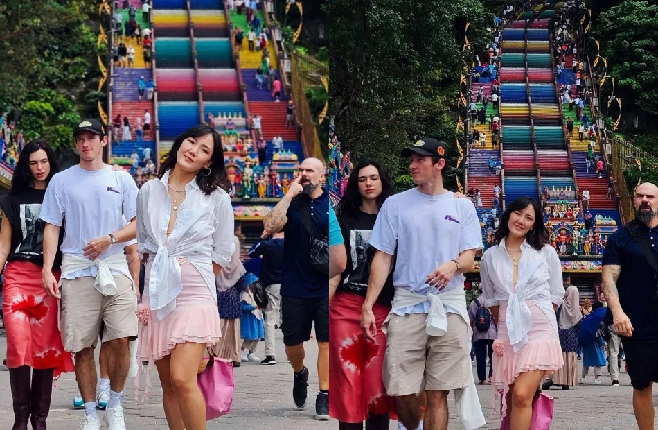 The “Houdini” songstress shared photos of the colourful temples at the popular location, as well as the monkeys she encountered there. Unfortunately, that’s all she shared on Instagram, and there’s no information yet on whether she visited other spots in KL—possibly to keep a low profile while out in public. However, she did make a surprise appearance in another person’s IG post. A fan was visiting Batu Caves as well and only realised that Dua and her boyfriend actor Callum Turner photobombed her from behind after the photos were taken.