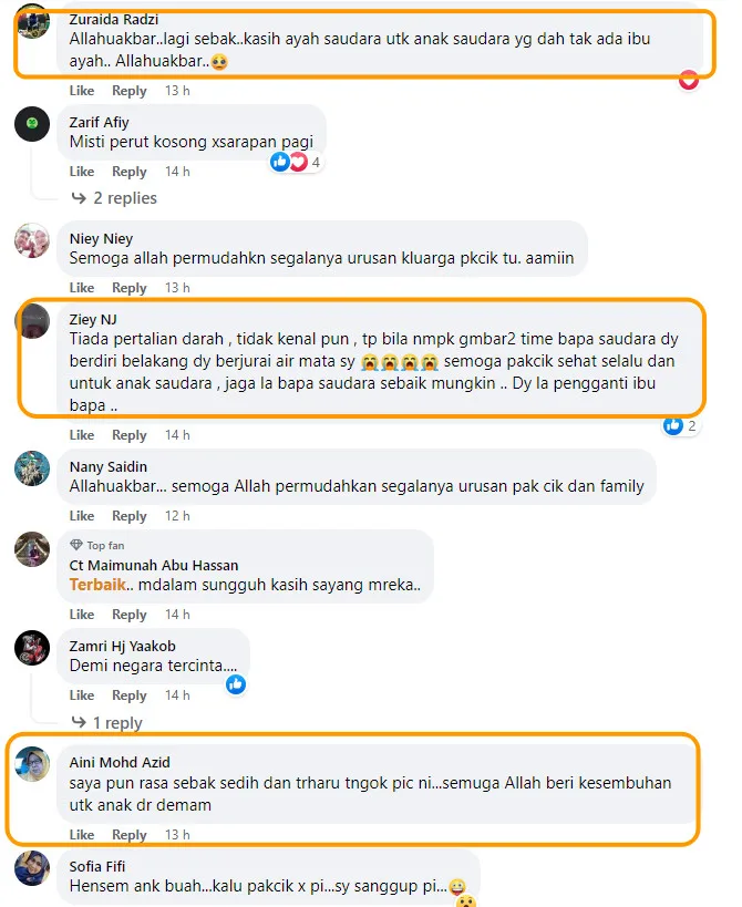 The posting has been flooded with plenty of remarks left by local netizens. Most of them were deeply moved by Abdul Aziz’s effort in coming to his nephew’s aid. One commentator told Nik Adhar, “Keep hold to this memory forever, Adik (Nik). Even though he’s only your uncle, he’s still like a father to you. Please take a good care of him.” Here are some of the comments that we found online:
