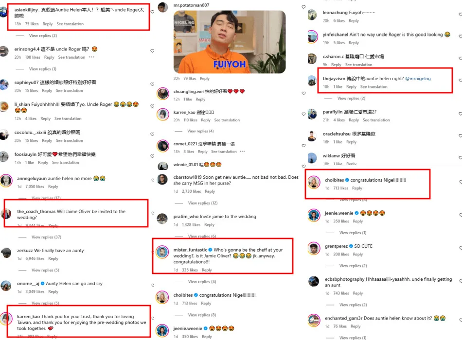 Many Taiwanese fans were surprised to see Nigel and his fiancée featured in Vogue Taiwan, with commenters praising how beautiful the couple looked in the photos. Some congratulated the comedian and Sabrina on their engagement, while others—unaware of his relationship—wondered if Sabrina was the inspiration for Uncle Roger’s ex-wife, Auntie Helen. Malaysian fans also jokingly asked if Jamie Oliver would be invited to the wedding ceremony.