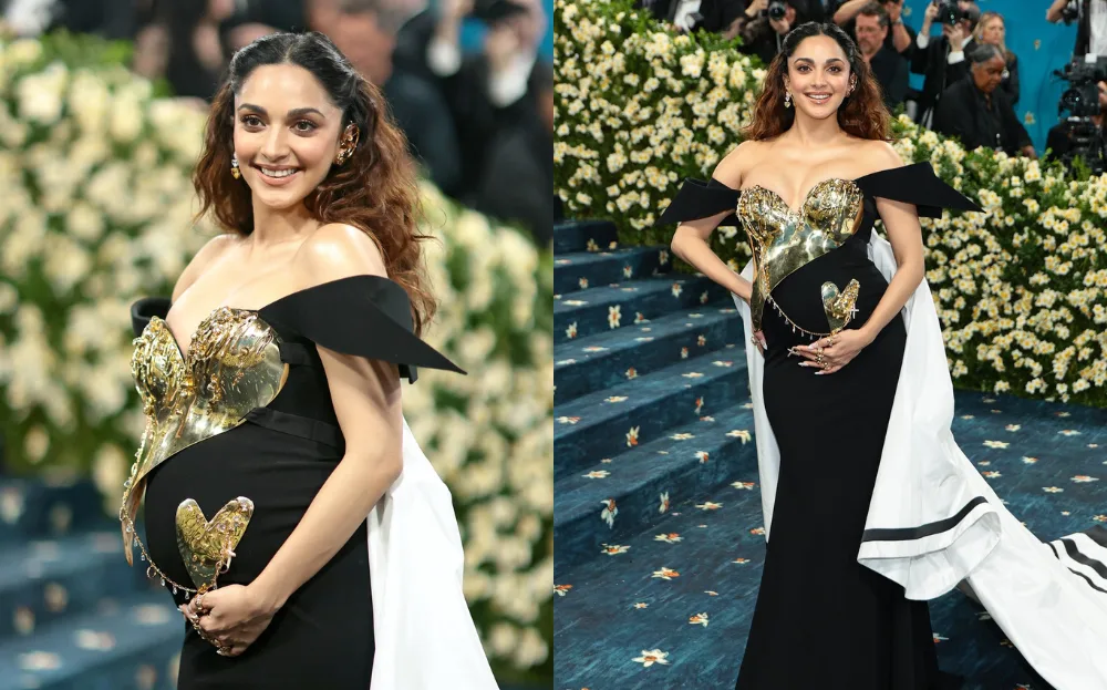 Indian actress Kiara Advani’s first appearance at the Met Gala is memorable for many reasons. The actress glowed on the blue carpet in her black-gold-white gown by Indian designer Gaurav Gupta and showed love for her growing baby bump with a heart-shaped mini plate.