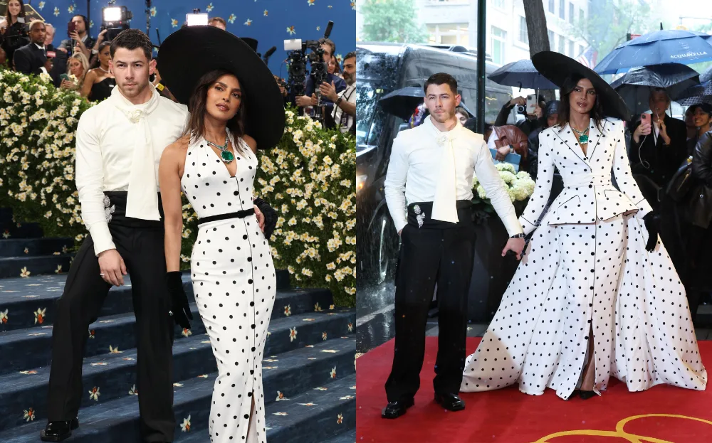 Turning heads at her fifth Met Gala appearance is actress Priyanka Chopra Jonas. The star walked alongside husband Nick Jonas, wearing a polka-dotted bespoke suit dress by Olivier Rousteing and jewellery by Bvlgari.