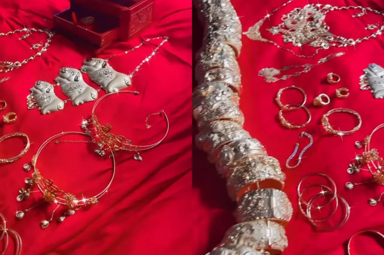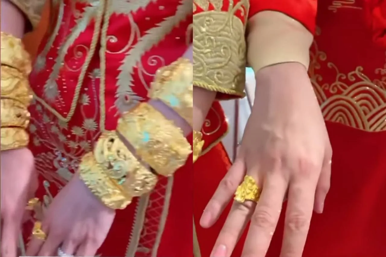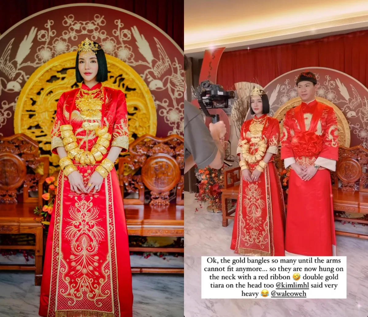 In addition to wow-ing her followers with the dreamy wedding backdrop, the 30-year-old Singaporean also managed to piqued netizens’ interest on her wedding dowries. If you think her Instagram posts are grand enough, wait ’til you see her Instagram stories: kaching$ of golds everywhere – From gold bangles, to huge gold piglets on gold necklace and even gold tiaras!