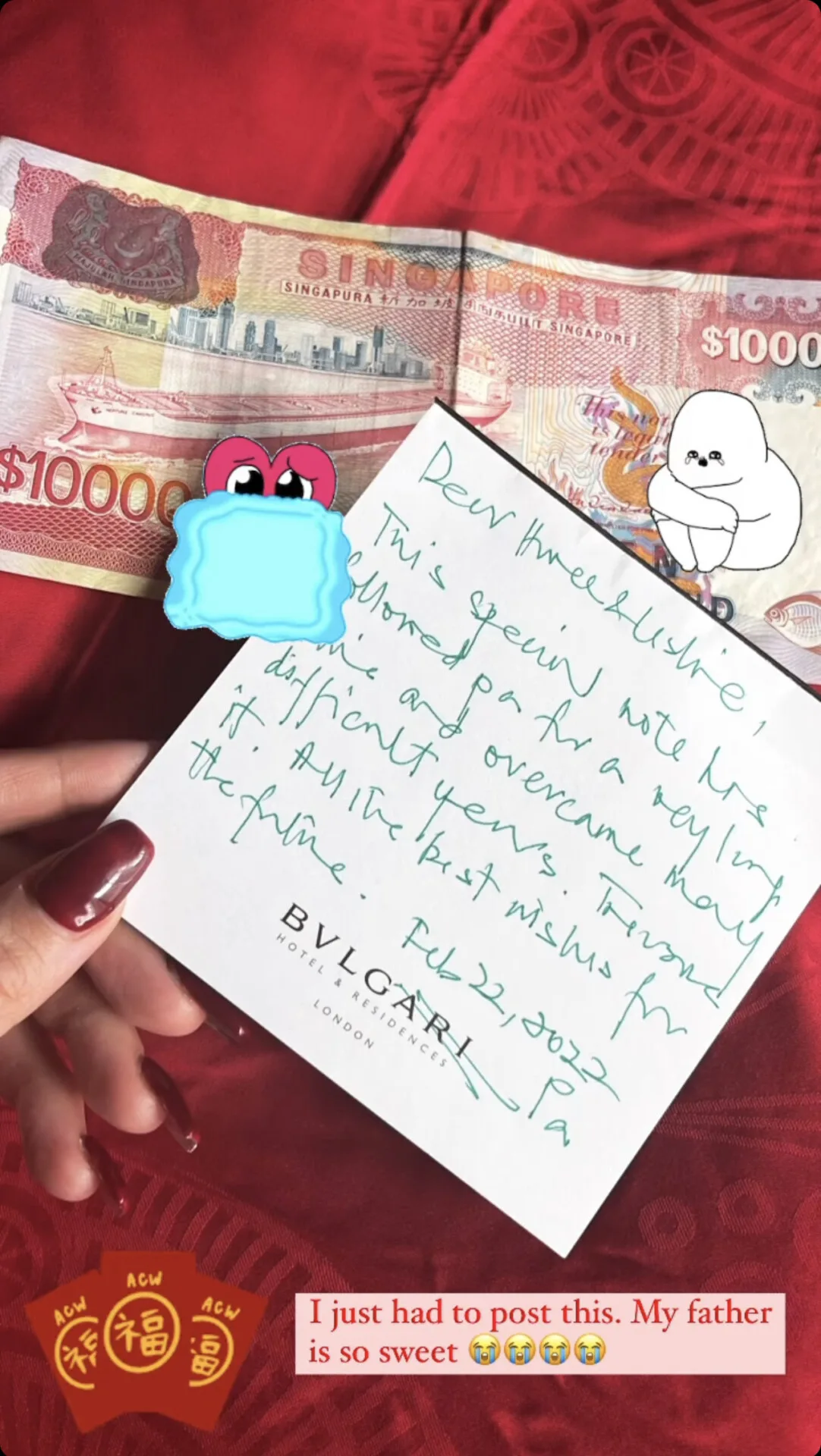 We would like to extend our congratulations to Kim Lim! Psst, her rich – billionaire philanthropist father Peter Lim – also gifted her with a special ang pow. He gave her a S$10,000 banknote with a handwritten note that said, “This special note has followed pa for a very long time and overcame many difficult years. Treasure it. All the best wishes for the future.”