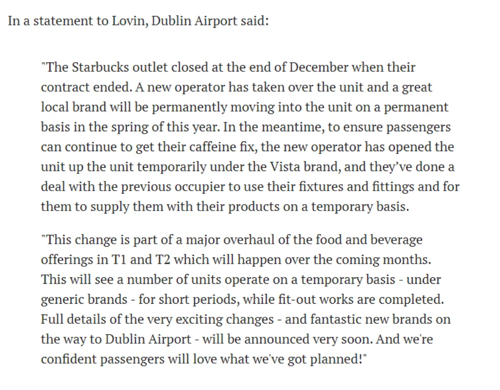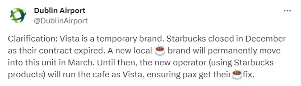 Despite the public outcry, Dublin Airport asserts that Vista Coffee is not a rebranding for Starbucks. According to a statement made by a spokesperson, the Starbucks outlet that previously occupied the space closed at the end of December following the end of their contract. The airport explains that Vista Coffee is a temporary coffee shop operating under a generic brand to offer customers another coffee shop option before a new operator takes over the space.