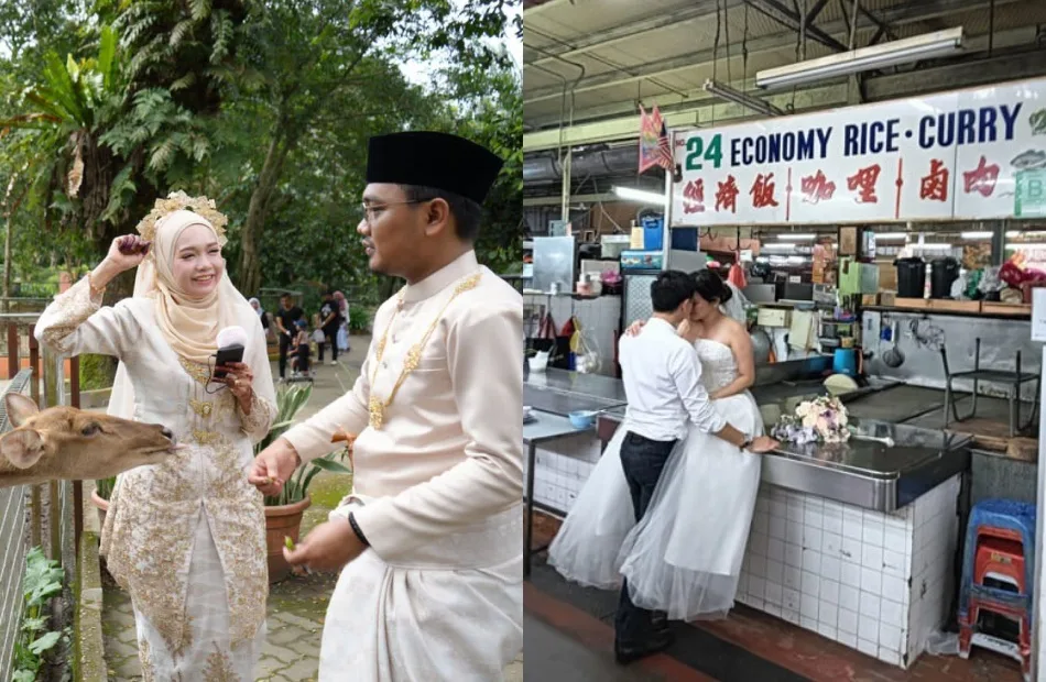 If wedding photos at a zoo weren’t bizarre enough, how about a mixed rice stall? Photos of a newly wedded couple circulated on Facebook with a caption that reads, “Perhaps the newlyweds met and fell in love while buying their meals, right?”. The photos showed the couple in their wedding attire posing for photos at a mixed rice stall at Batu Lanchang Market Food Center in Penang.