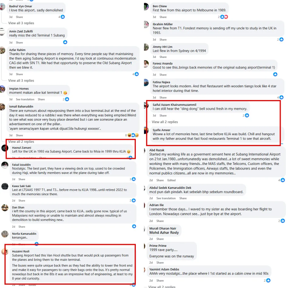 Many spoke about their last visit to Subang International Airport during their travels, while others highlighted some of the unique features of the airport, such as the Van Hool shuttle bus that would pick up passengers from the planes and take them to the main terminal. Some were saddened by the fact that they could no longer see much of the original building after it was rebranded as Sultan Abdul Aziz Shah Airport.