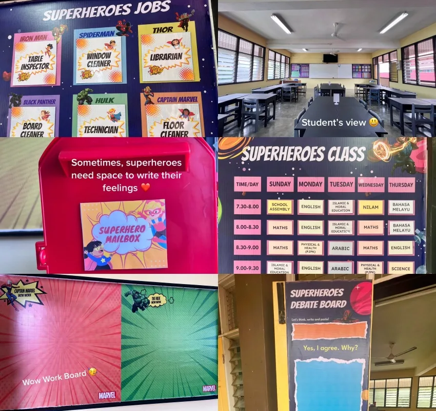 In the next slides, the teachers brainstormed some theme ideas to decorate the classroom. They considered themes such as outer space, under the sea, and even in the jungle before finally deciding on a Marvel Superheroes-themed classroom. The TikTok post then showed what the classroom looked like after it was fully redecorated. The front doors are now covered with a welcome greeting and classroom rules that featured members of The Avengers.