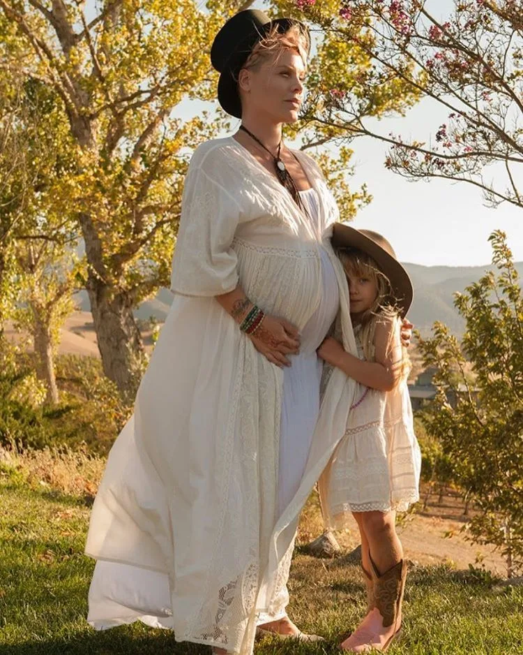 Looking ethereal and serene, Pink is seen showing off her baby bump as her 5-year-old daughter Willow Sage cuddles her. In the sweet picture above, the mother-daughter duo can be seen wearing matching white lacy outfits and hats with the wind blowing through their hair.