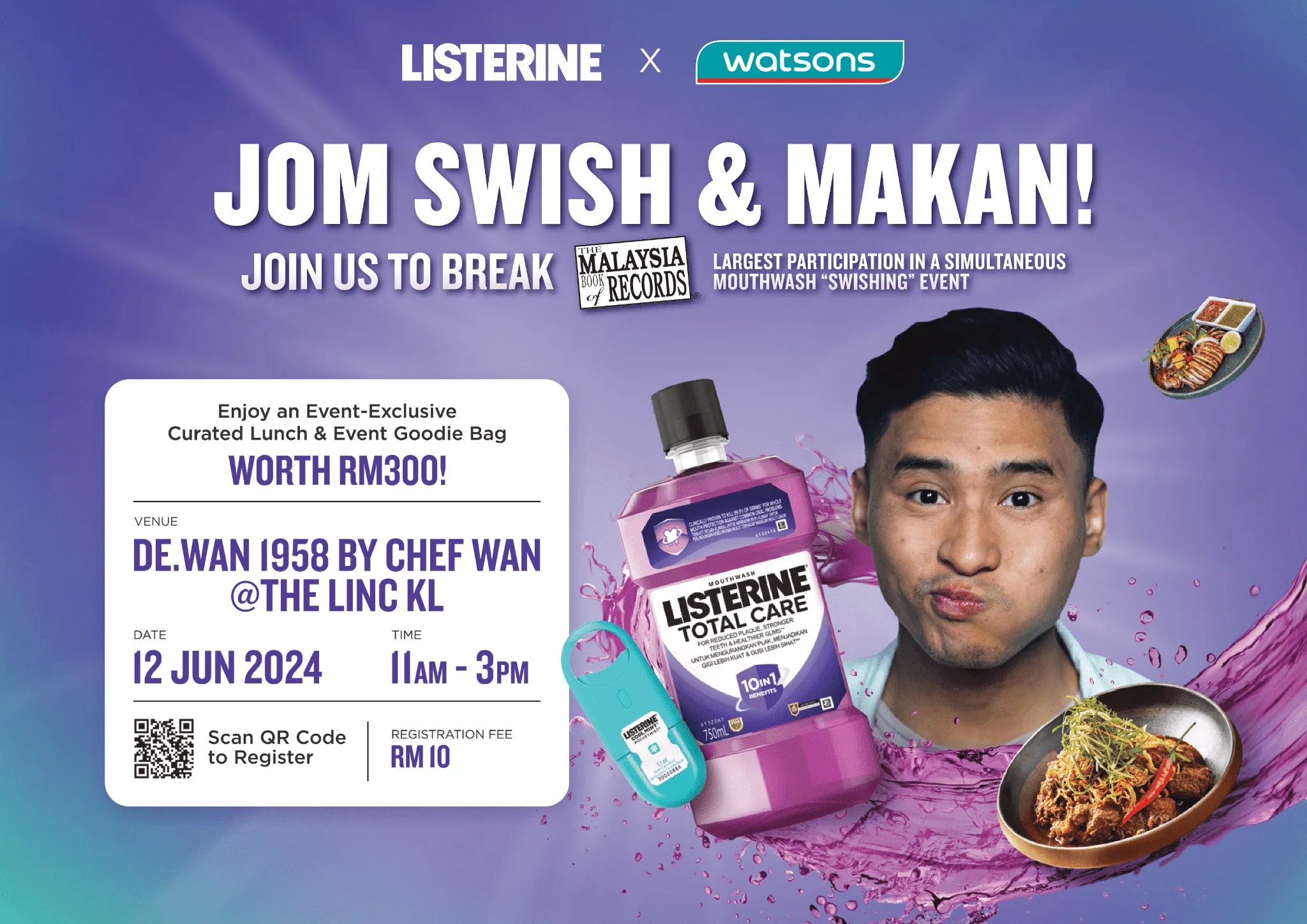 LISTERINE is inviting you to be part of a once-in-a-lifetime opportunity to break the Malaysia Book of Records! At the ‘Swish & Makan’ event, you will get to experience attempting to break a record alongside 2,000 other participants, meeting renowned chef Chef Wan and indulging in his critically acclaimed recipes – so click here for more info!