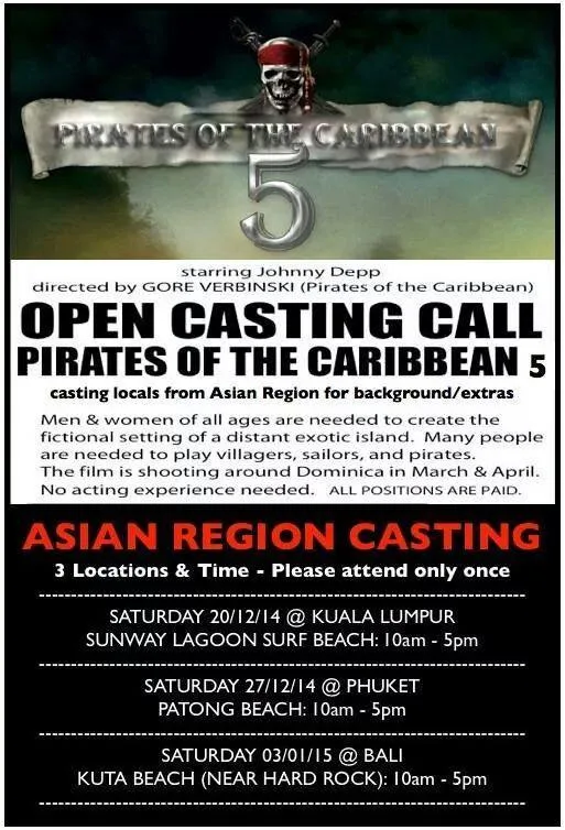 As stated in the poster above, there’s a rumoured open casting call for “Pirates of The Caribbean 5”, casting locals from Asian region for background/extras. It also goes on to say that men and women of all ages are needed to create the fictional setting of a distance exotic island, to play villagers, sailors, and pirates. Best of all, no real acting experience is actually needed for positions that will be paid. Also, it states that “Pirates of The Caribbean 5” film will be shooting around Dominica in March and April. Whoa, wait. Hold up.