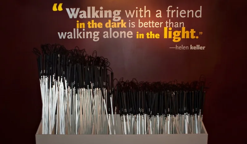 In the Dialogue in the Dark exhibition, visitors are led by visually impaired tour guides in small groups for an hour through a completely darkened space where sounds, wind, temperatures and textures turn daily routines in the dark into new experiences.