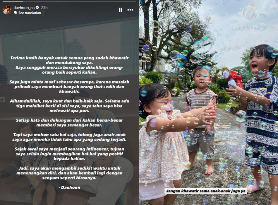 Taking to his Instagram Story, Daehoon expressed his gratitude to his followers for their concern over his relationship with his wife and the well-being of their children. “I’m grateful to be surrounded by good people like you. I’m sorry if my personal matters have made you sad or worried. Alhamdulillah, I’m fine. As long as I have these three angels with me, I’ll be able to get through anything,” he wrote.