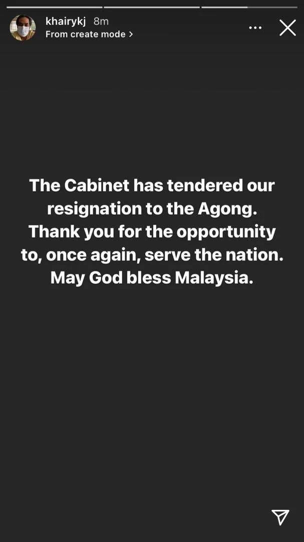Science, Technology and Innovation Minister, Khairy Jamaluddin, has confirmed the resignation of the entire cabinet via his Instagram Stories today. He said, “The cabinet has tendered our resignation to the Agong. Thank you for the opportunity to, once again, serve the nation. May God bless Malaysia.”