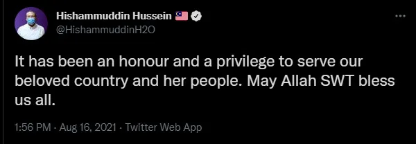 A tweet by Datuk Seri Hishamuddin Hussein states, “It has been an honour and a privilege to serve our beloved country and her people. May Allah SWT bless us all.”