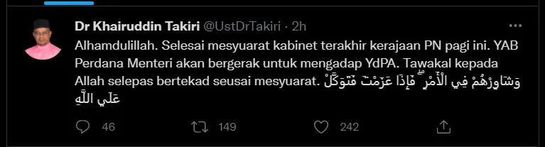 His caption reads, “God willing. The last Perikatan Nasional cabinet meeting this morning is over. The Prime Minister is making his way to meet the Yang di-Pertuan Agong. When you are determined to make a decision, then trust and surrender to God because God loves those who trust him (enough) to surrender.”