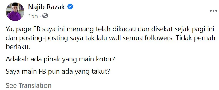Najib realised his Facebook page might had been blocked since Thursday morning (8th April). His followers left comments that his posts were not being displayed on their interface and were concerned. Many, including the former PM himself, suspected someone had tampered with his page. “Is someone creating trouble?” he wondered. “Are they scared because I ‘play’ on Facebook?”