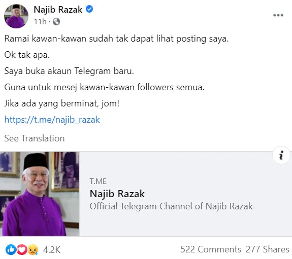 Last night (8th April), Najib announced he would continue to post on Telegram instead. “Many friends are now unable to see my posts. Ok, it’s fine. I will open a new Telegram account and use it to message my followers,” he wrote. “If you’re interested, come join!”