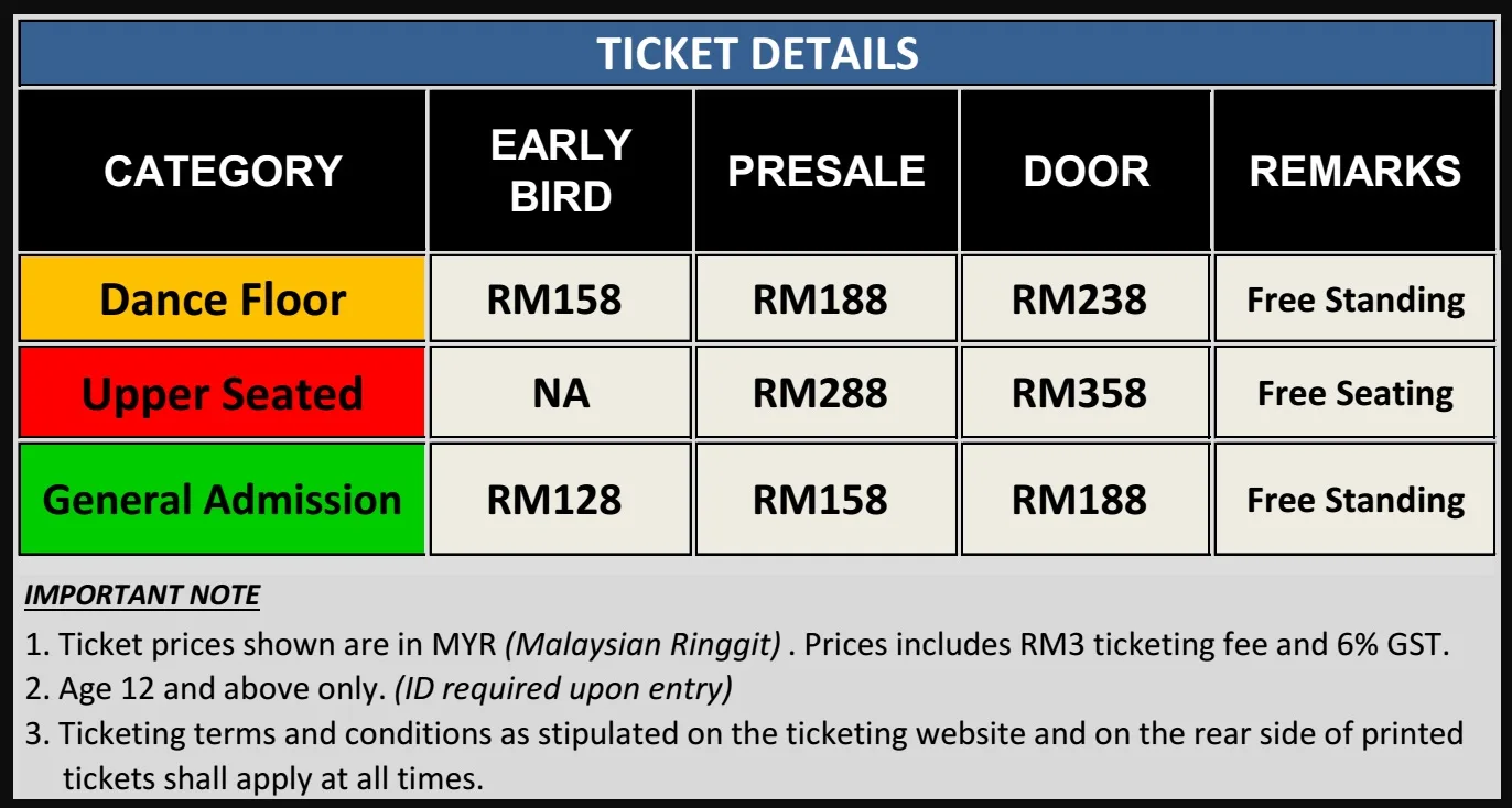 • Ticketing: Refer to Price Table below