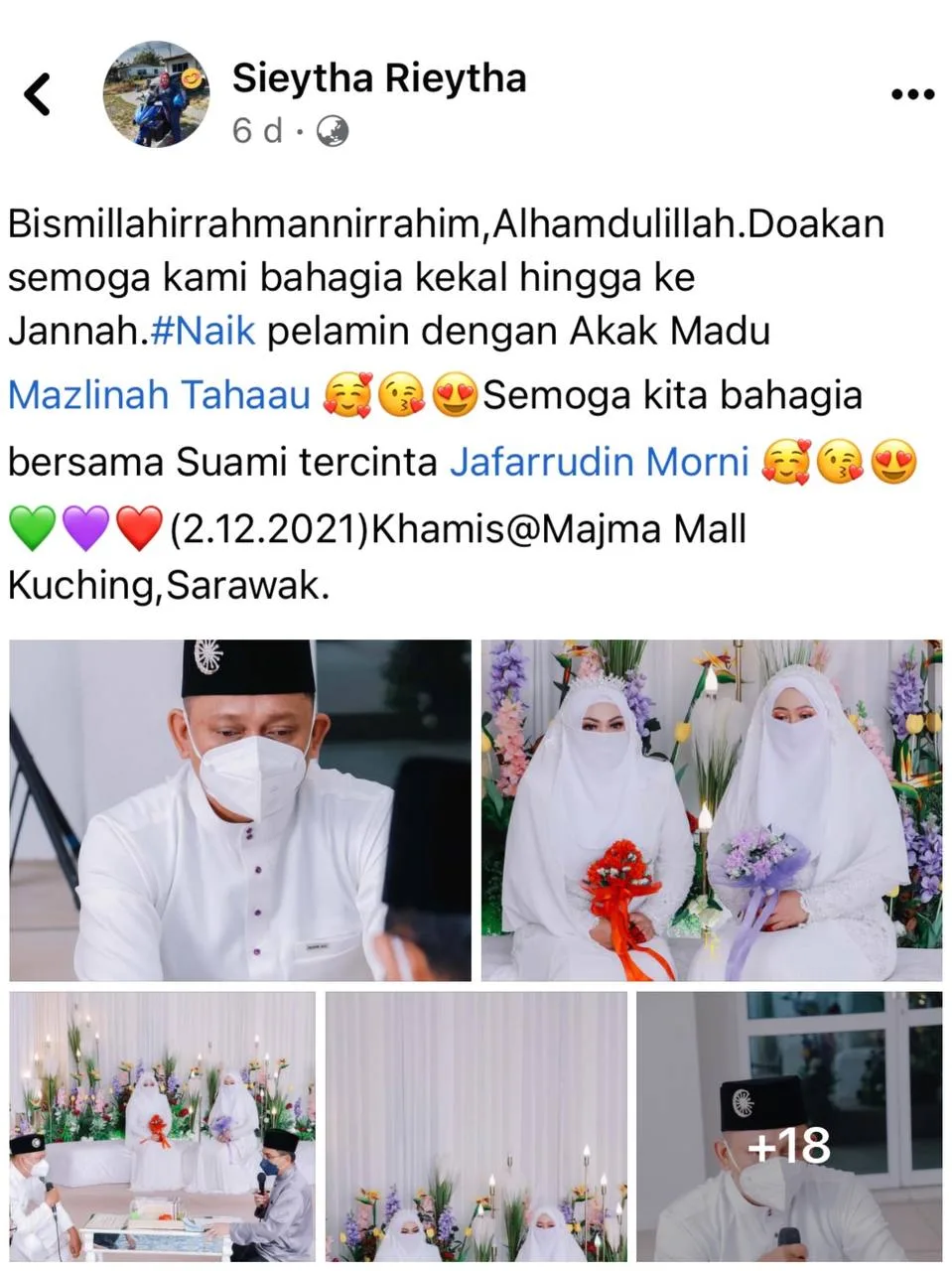 She reposted some of the photos from the solemnisation ceremony and captioned it, “In the name of Allah, the most generous and merciful, thank God. Pray for us so that we will always be happy till Jannah. Got married alongside my husband’s other wife, Mazlinah Tahaau. May we be happy with our beloved husband, Jafarrudin Morni. (2.12.2021) Thursday @ Majma Mall, Kuching, Sarawak.”