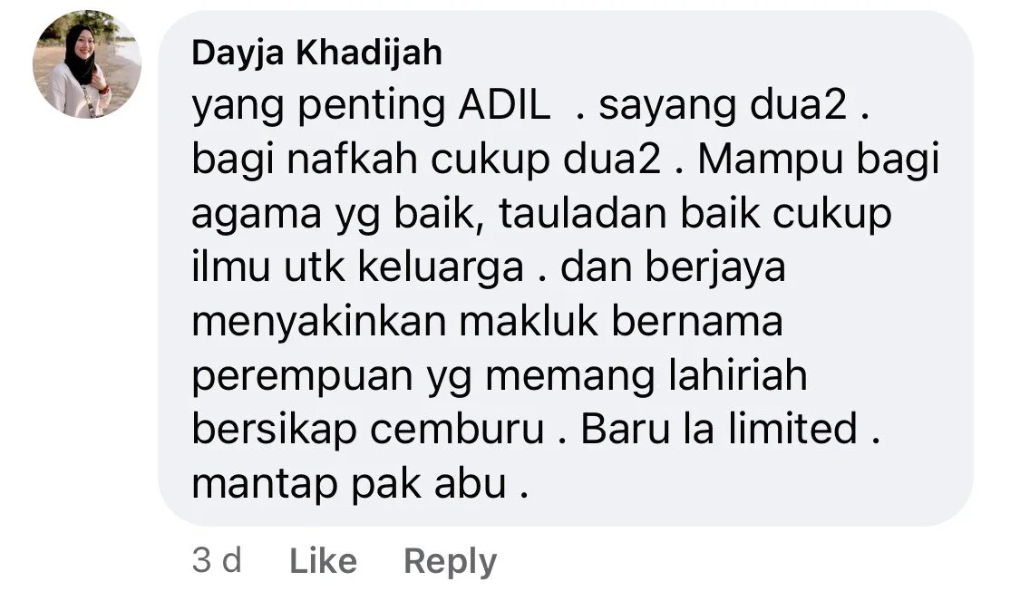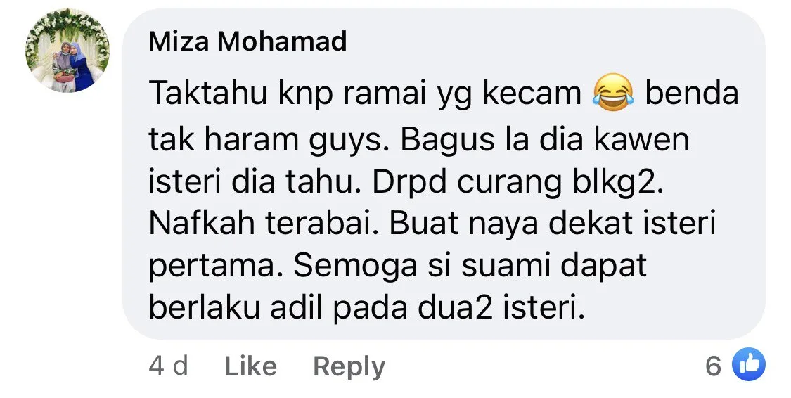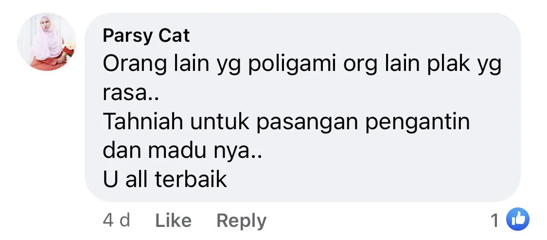 Another netizen made a good point at those who criticised the man for marrying two women. She stated on her comment, “I don’t understand why are there people criticising. It’s not illegal. It’s better that he got married and his wife knows. Rather than he cheats his wife, does not support his wife financially (or) commit other sins. May the husband treat both his wives fairly.”