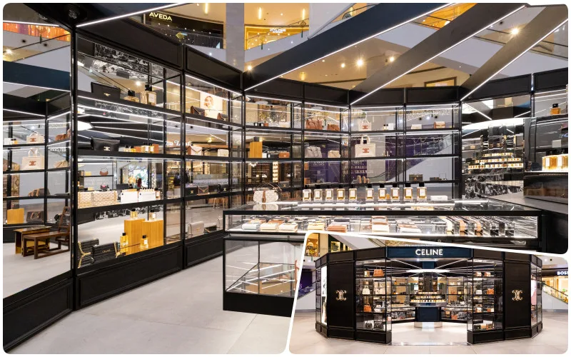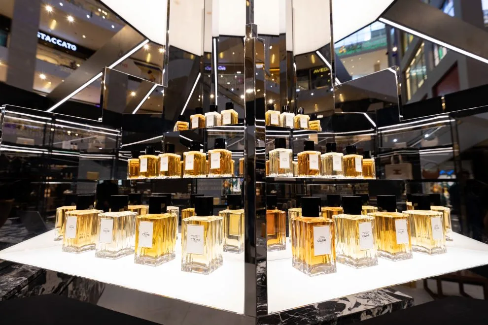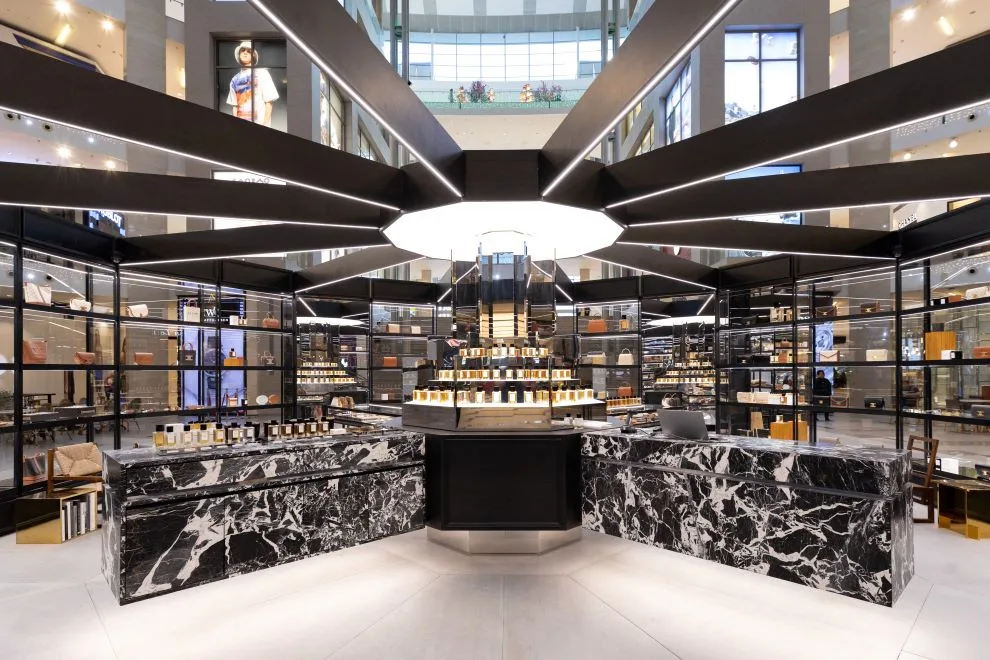 The decor features marble and traditional Parisian architecture, reflecting an aura of luxury and elegance, reminiscent of the glorious past of France to the present. Amber perfumes in square glass bottles contrast with polished black lacquer caps arranged in a high staircase, like a work of art. Talk about IG-worthy!