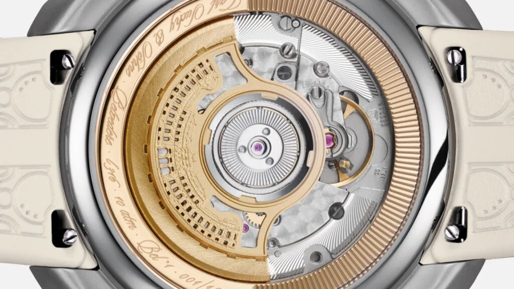 A special feature of the Belvedere wristwatches is the unique date display, which is also present in both Champagne and Bordeaux versions. The moving date window, which advances day by day, not only guarantees excellent legibility but also creates a vibrancy on the dial. The golden rotor, embellished with a finely micro-engraved facade of the Belvedere palace, transforms each watch into a singular objet d’art, exuding exclusivity.