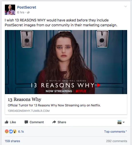 In their caption, PostSecret wrote, “I wish 13 REASONS WHY would have asked before they include PostSecret images from our community in their marketing campaign.”