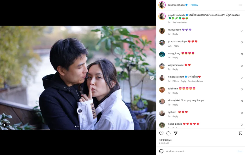 It’s been half a year since Thai model-actress Treechada Poyd Bejarat (Poyd Treechada, ตรีชฎา เพชรรัตน์) tied the knot with long time beau Phakwa Hongyok (บรรลุ หงษ์หยก) aka Oak. And their happy marriage has apparently only gotten happier over time!