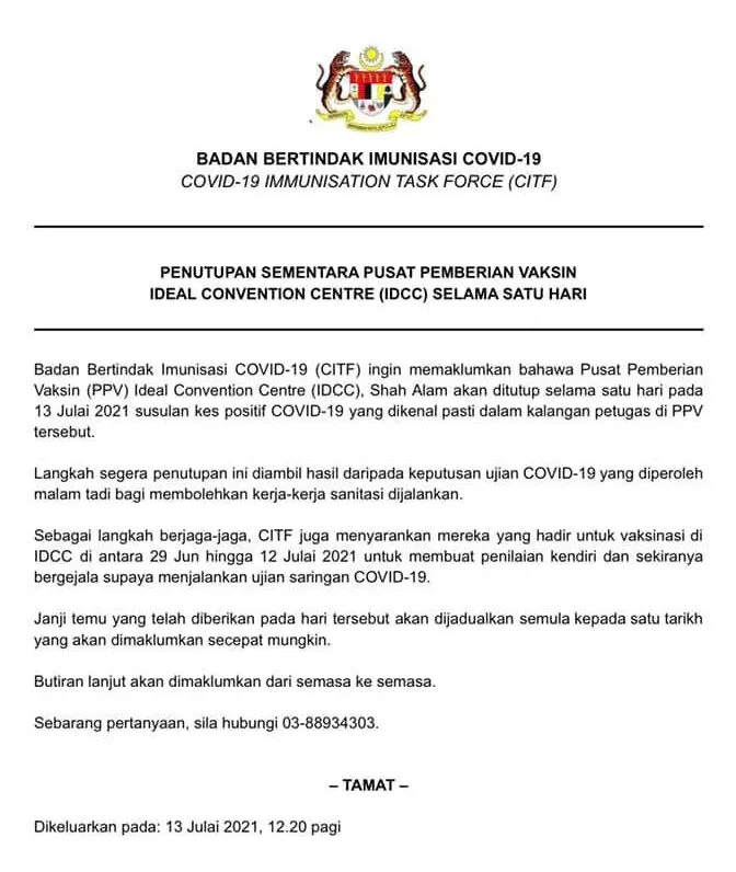 The Covid-19 Immunisation Task Force (CITF) has announced that the vaccine administration centre (PPV) at the Ideal Convention Centre (IDCC) in Shah Alam will be closed today (Tuesday, 13th July).