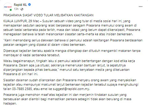 They have since apologised for their employee’s actions. Prasarana has also stated that they would be taking appropriate actions to prevent similar incidents in the future. If anyone has any information regarding the issue, they have been requested to contact the company, either by their hotline (03-7885 2585) or by e-mail (suggest@rapidkl.com.my).