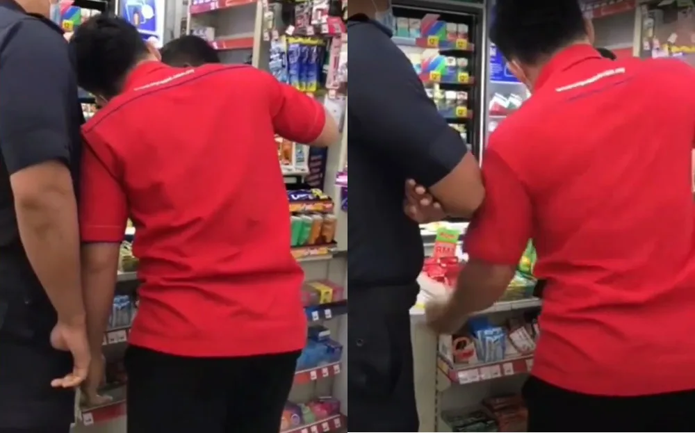 Another clip in the video showed the man holding two cup noodles in his hands. A man with a “auxiliary police” patch on his shoulder could be heard telling the victim to put down the cups and leave the store. When the man attempted to plead with the auxiliary police, he demanded the victim pay up.