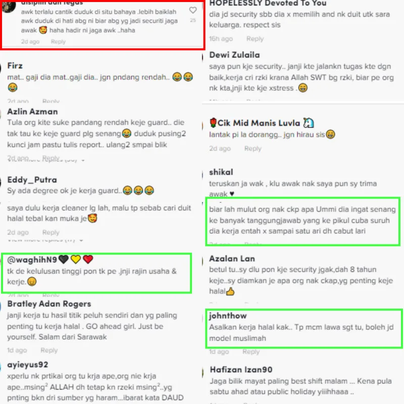 TikTok user Siti Nurul Atiqah Nawawi, who goes by the username @02dec92 posted a series of videos on her profile responding to comments by netizens who belittled her for having a job as a security guard. In the first video, she responded to a comment that said she has no qualifications to apply for a ‘better job’. “Those with PHDs aren’t even guaranteed to secure a job. Show yourself if you’re man enough”, she captioned.