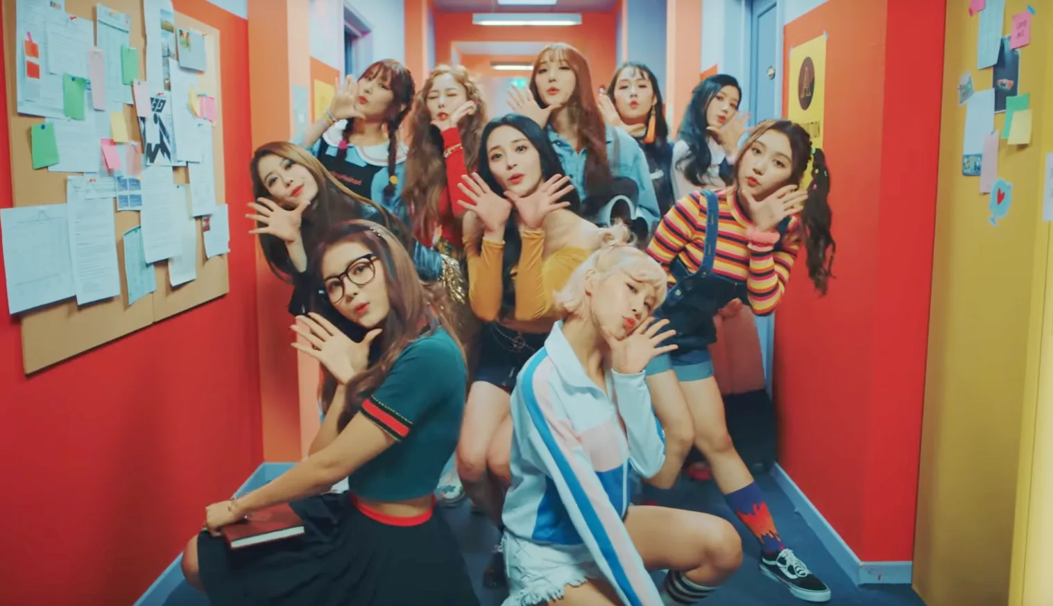 In their debut music video, we see all 10 members dressed up in various outfits such as school uniforms, sports wear, and more. They can be seen dancing cutely while looking seductively at the camera.