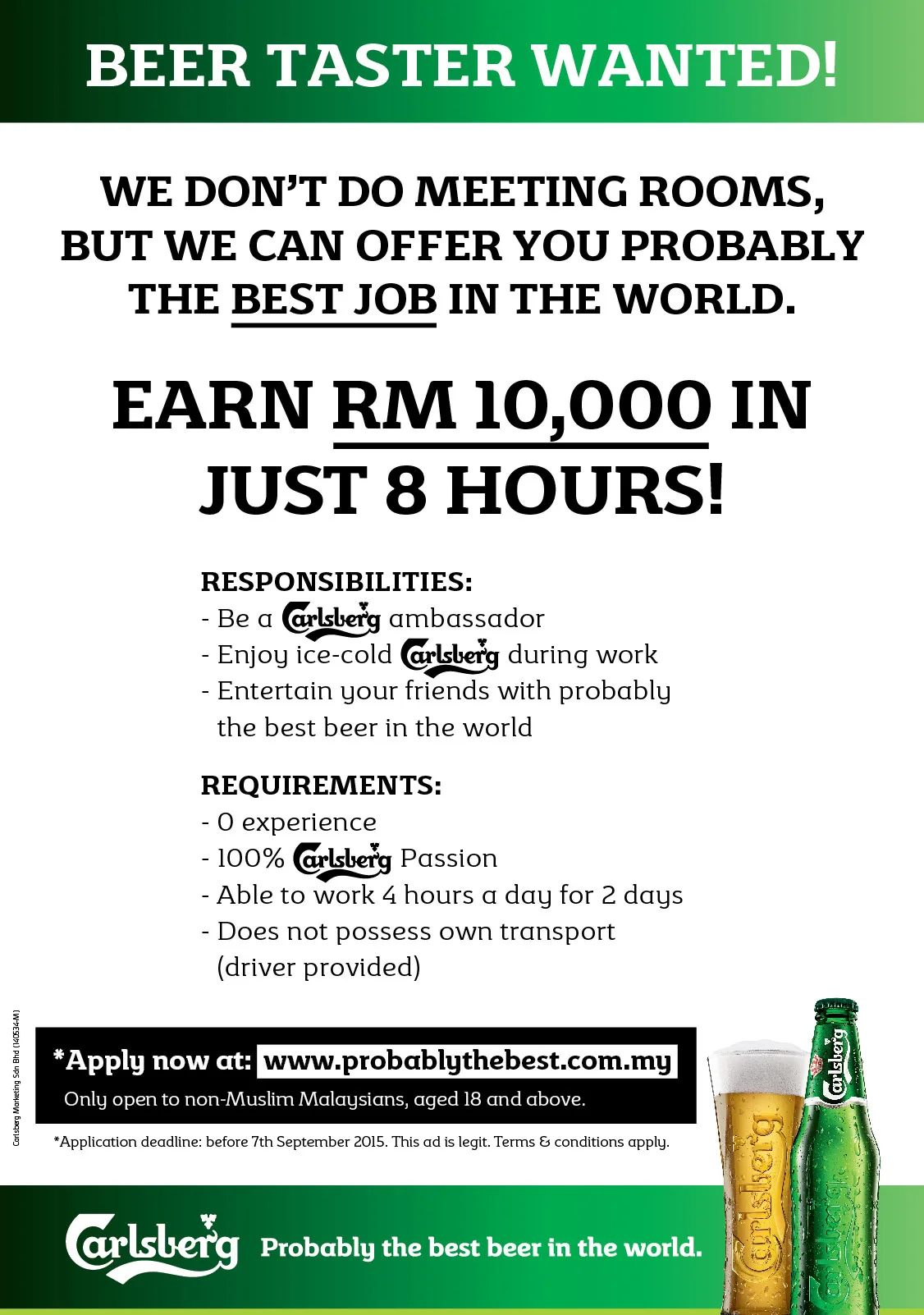 Well, it only gets better because the 2 successful Carlsberg candidates do not need to possess any experience or educational background relevant to the beer industry. All he or she needs is a burning passion and 100% love for Carlsberg brew and to be available for 2 days, undertaking the role of a Carlsberg ambassador.
