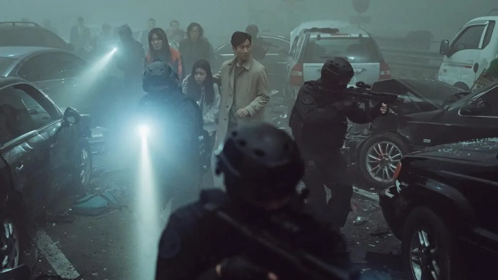 On the way to the airport, the bridge they have to take is shrouded in thick fog. They’re eventually ensnared in a series of car crashes, which also leads to a pack of killer dogs being released. The dogs go on to attack all on the bridge who survived the massive pile-up. From there, the survivors must escape the slowly collapsing bridge as they simultaneously uncover the plot behind the genetically-engineered dogs which are part of “Project Silence.” Being a politician, Jung-Won is torn on what stance he should take as he uncovers the truth behind the conspiracy.