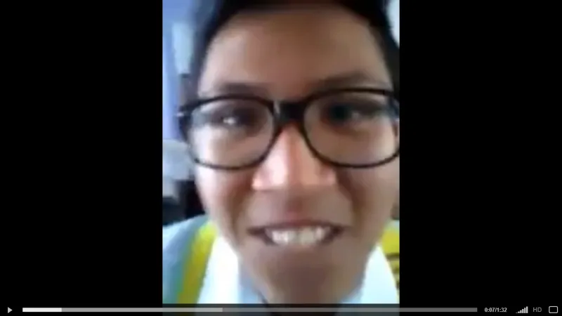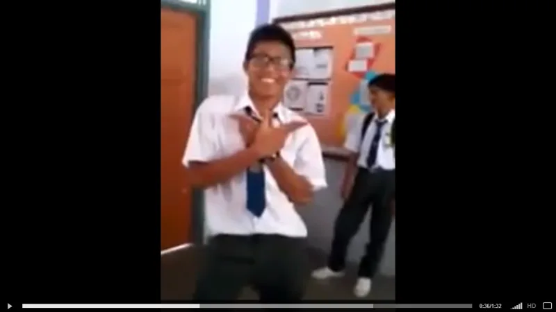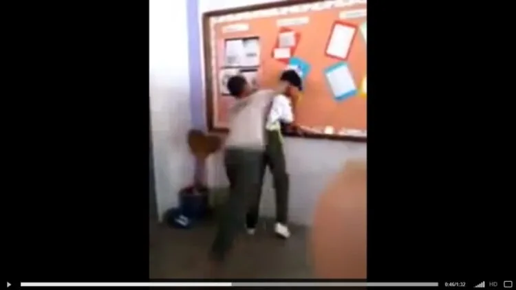 The video starts with a group of students crowding around the camera in a classroom, happily posing for a picture. The footage then gets abruptly cut before starting up again to show one of the students kicking and punching another student, who still had his bag with him.