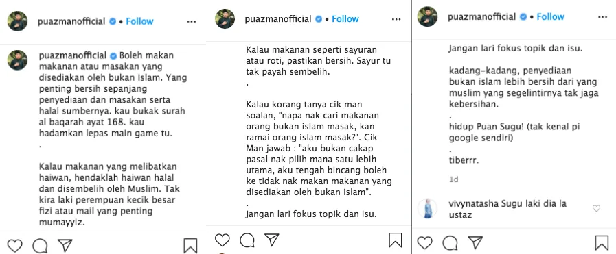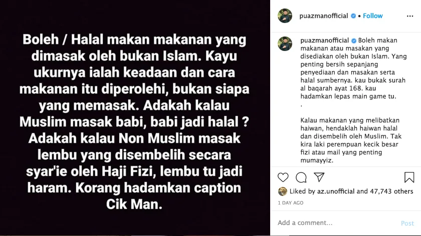 “What should be taken into account is the condition as well as how the food was obtained. Can we consume pork if the meat was cooked by a Muslim? Also, if non-Muslims prepared beef that had been slaughtered according to Muslim law by Haji Fizi (example), is it still considered haram? Do read and digest my caption.” PU Azman wrote on the statement posted on his Instagram.