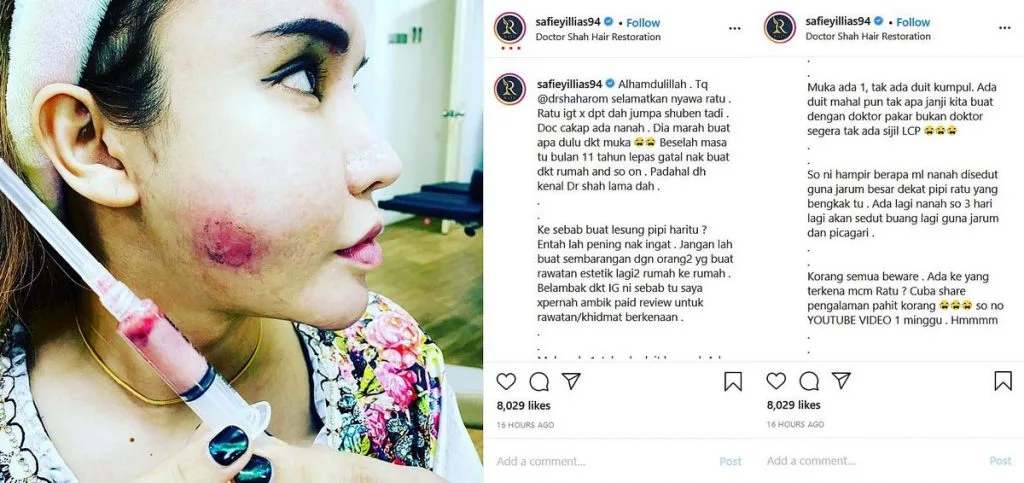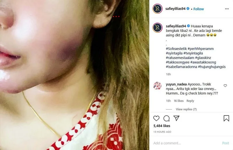 Safiey uploaded a photo showing her swollen cheeks, before it became severely purulent, on her Instagram. According to her, the worsening condition has begun to affect her well-being now. She then sought a follow-up treatment at a certified aesthetic clinic.