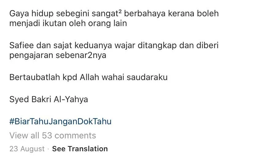 PU Syed also criticised the cosmetics business mogul over her sinful act, fearing that the public might follow suit. That’s not all! In the caption, the religious figure also hopes that the authorities will arrest both Safiey and her friend, Nur Sajat, to teach them a lesson.