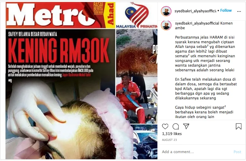 The “Pencetus Ummah” alum took to his Instagram to share his views, where he claims that what Safiey had done was clearly against Islamic teachings. “Those actions are clearly haram (forbidden) in the law because the individual has changed God’s creation without any acceptable reasons allowed by religion,” wrote PU Syed.