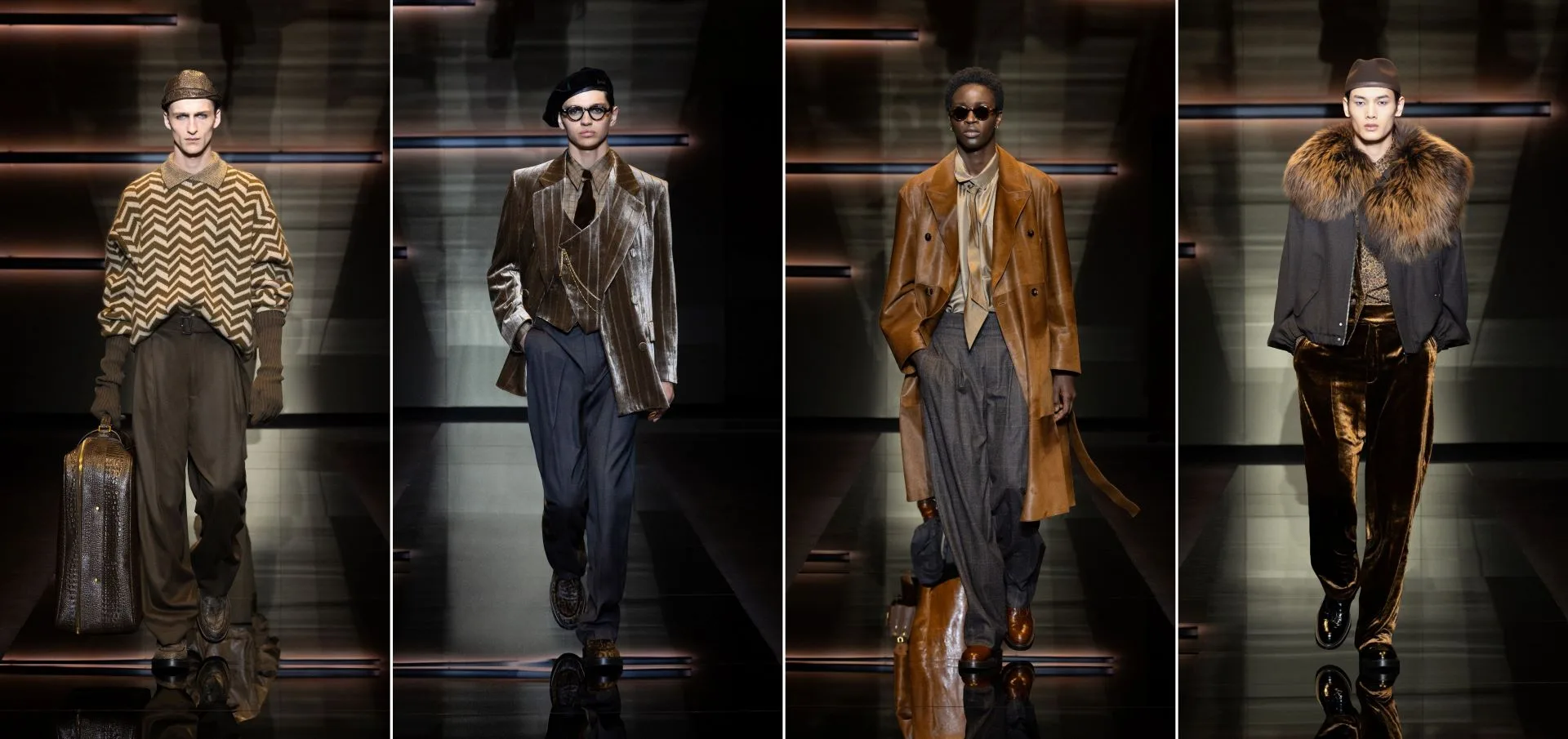 Emporio Armani’s Autumn/Winter 2025/26 Men’s Collection is a masterclass in effortless seduction, blending refined elegance with bold statement pieces. Think long, luxurious coats, sharp blazers with defined shoulders, and wide, pleated trousers that flow with confidence. A touch of animal print on loafers and coats adds intrigue, while metallic-threaded pullovers bring a subtle shimmer to the mix.