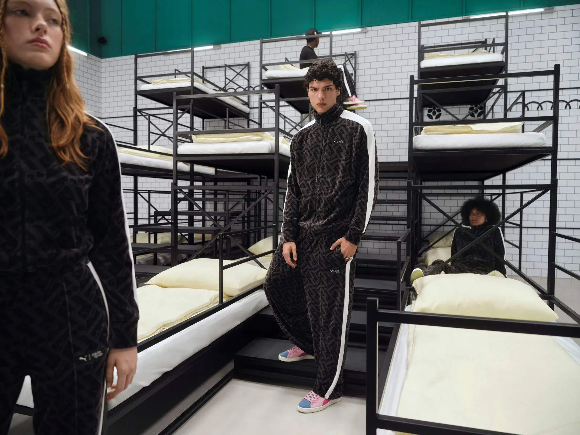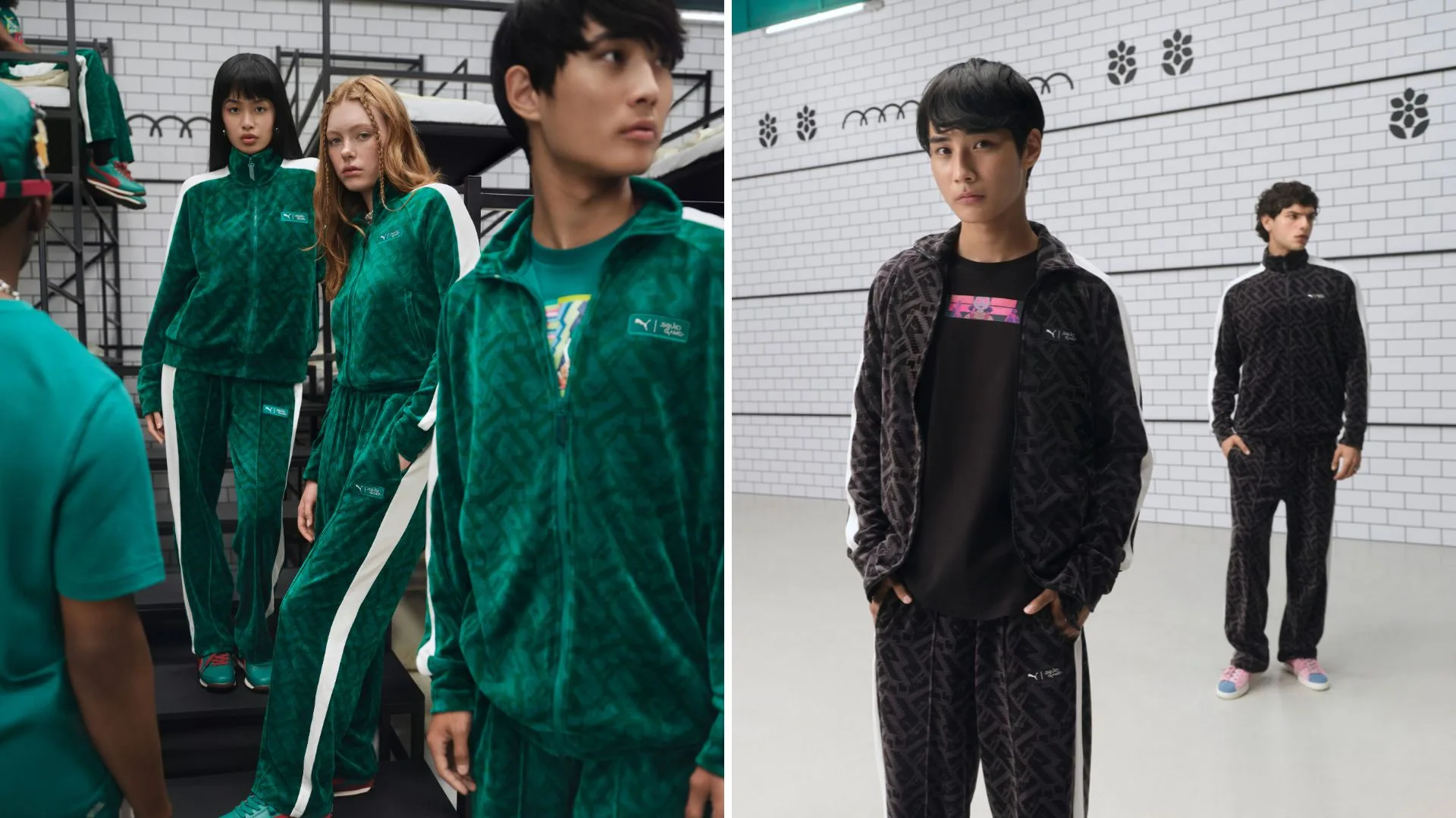 At the heart of the collection is the remade T7 tracksuit, worn by the contestants in the new season. PUMA has reimagined its signature T7 Track Jacket and T7 Track Pants with a custom staircase-inspired pattern and hidden PUMA logos, paying homage to the teal-green uniforms worn in the deadly contest. The velour fabric is complemented by cobranded chest labels and custom hangtags, creating a standout look for fans of the show.