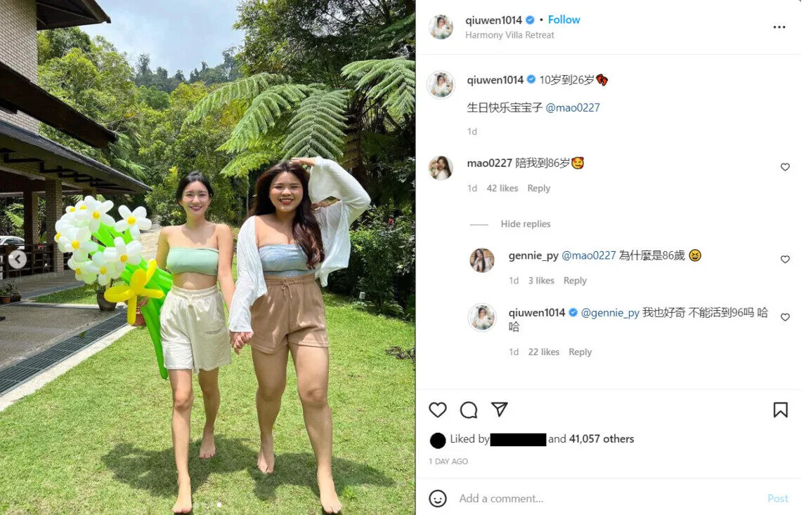 MaoMao turned 26 on 28th February, much to the delight of her friends and family. As always, many flocked to Instagram to wish her well, Qiu Wen included. “10 years old to 26 years old,” she stated, commemorating how long they’d known each other. “Happy birthday, baby!” MaoMao cheekily responded, “Accompany me until (I’m) 86,” and Qiu Wen teased her back, saying, “Can’t you live till 96?”