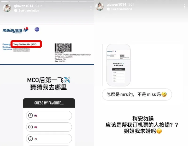 The influencer has always kept her fans updated on her life. Yesterday (20th April), was no different. Qiu Wen uploaded a plane ticket to her Instagram Story. “First flight after MCO, guess where I’m going,” she said, teasing her fans. Although that was certainly an update, fans were more curious about her listed name.