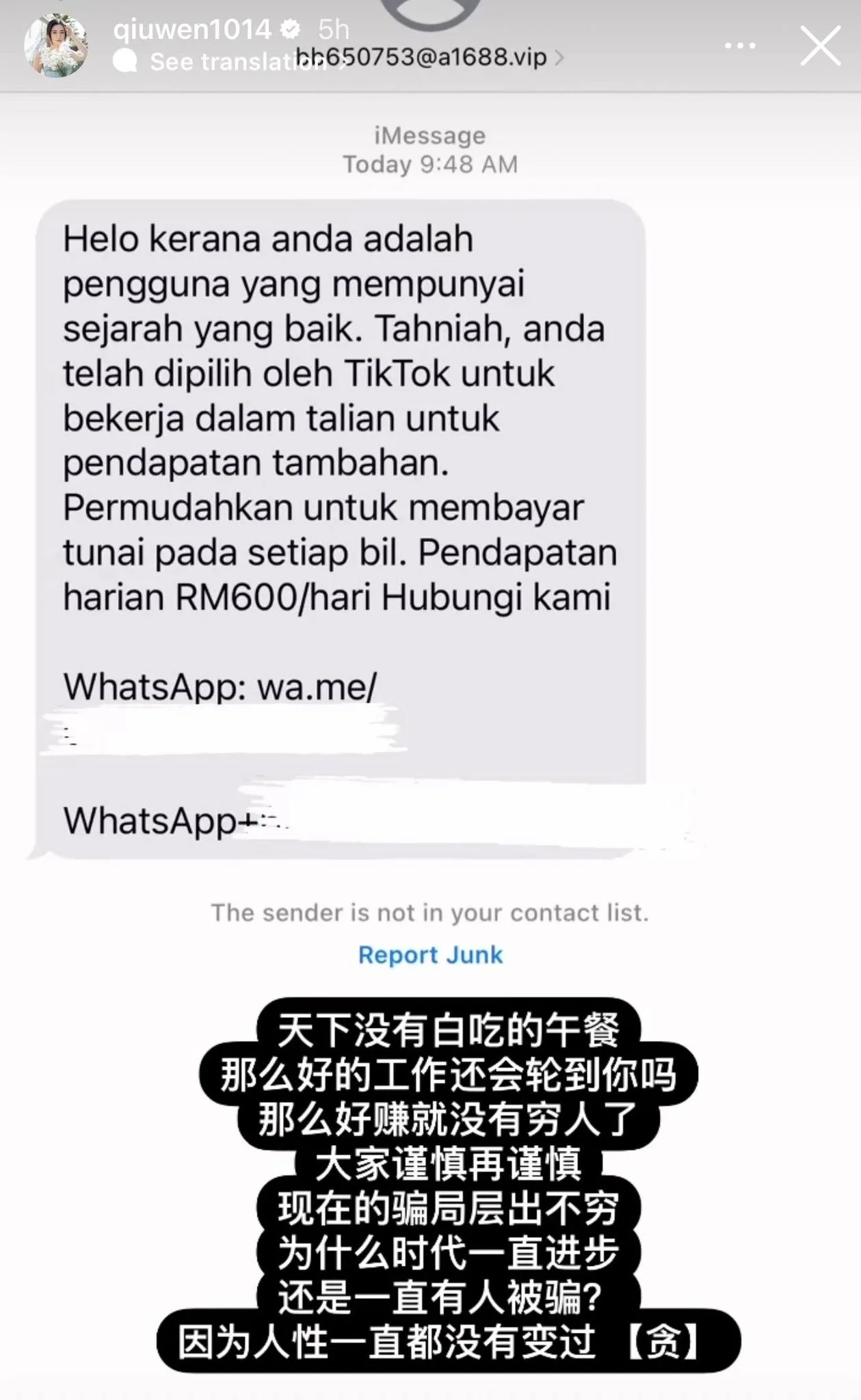 Earlier today (Monday, 22nd August), Qiu Wen took to her Instagram Story to post a screenshot of a scam text message she received. If you are an iPhone user, you may have received the exact same message from some claiming to be from TikTok. The message (in Malay) congratulates the receiver on being a loyal customer. As such, the lucky person has been selected by TikTok to work for the platform for RM600 per day.