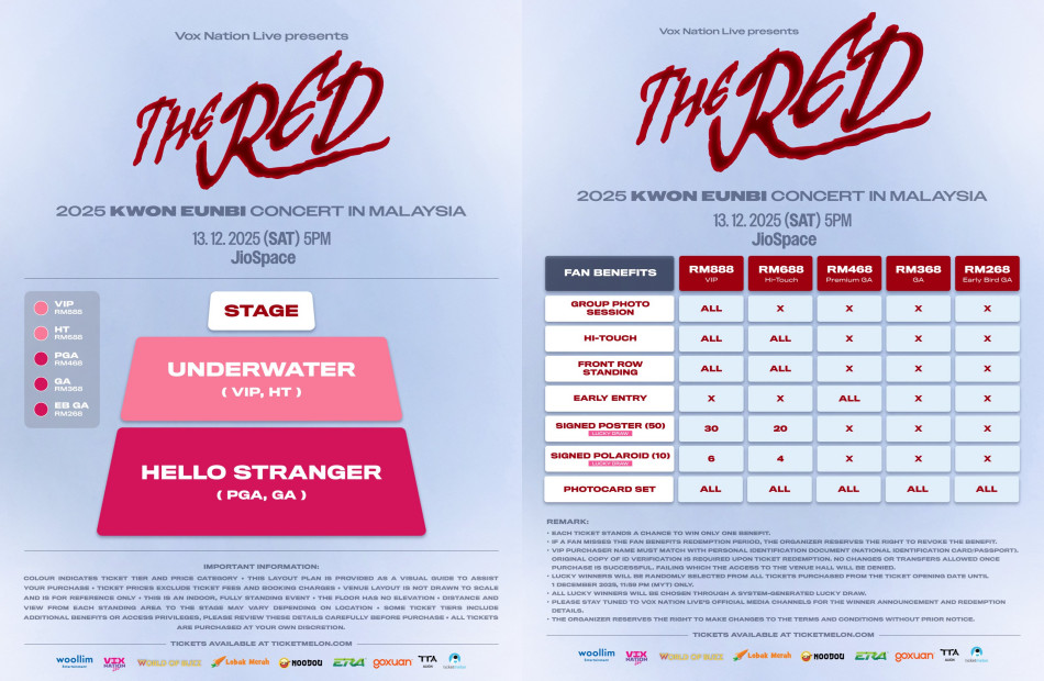 - Ticketing: RM888 (VIP), RM688 (HT), RM468 (PGA), RM368 (GA), RM268 (EB GA)